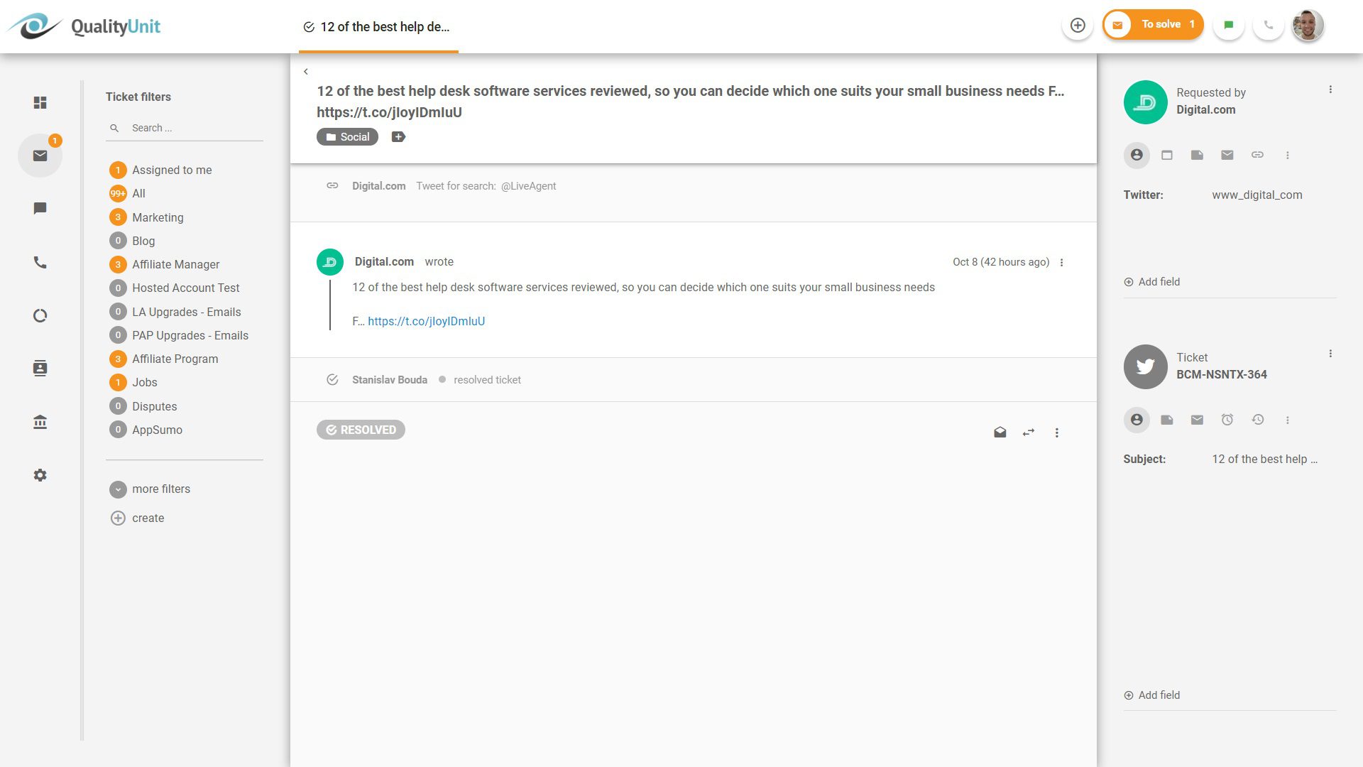 LiveAgent offre le taggage des réseaux sociaux.