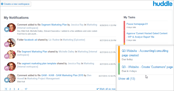 Huddle figure également en tête de notre liste, tout simplement parce qu’il ne s’agit pas seulement d’un portail client, mais de l’une des meilleures solutions logicielles de portail du marché. Plus important encore, Huddle mélange avec succès l’engagement des clients et la gestion des documents, permettant aux utilisateurs de créer des espaces de travail intranet pour les équipes, les partenaires et les clients.