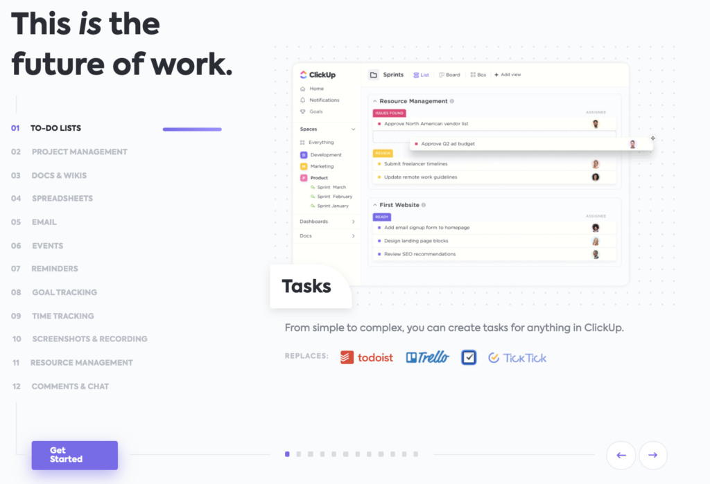 ClickUp est une solution de gestion de la collaboration basé sur le cloud et de gestion de projet faite pour les entreprises de toutes tailles et de tout type de spécialisation. Elle offre une variété de fonctionnalités puissantes élaborées pour la gestion des tâches, comme les alertes, l’affectation des tâches et tous les statuts.