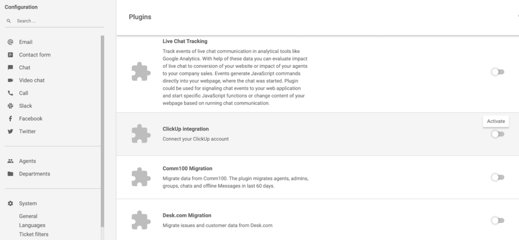 - Ouvrez LiveAgent et allez dans Configuration > Système > Plugins. Trouvez l’intégration ClickUp dans la liste des plugins et cliquez sur le bouton d’activation. LiveAgent va redémarrer après cela.