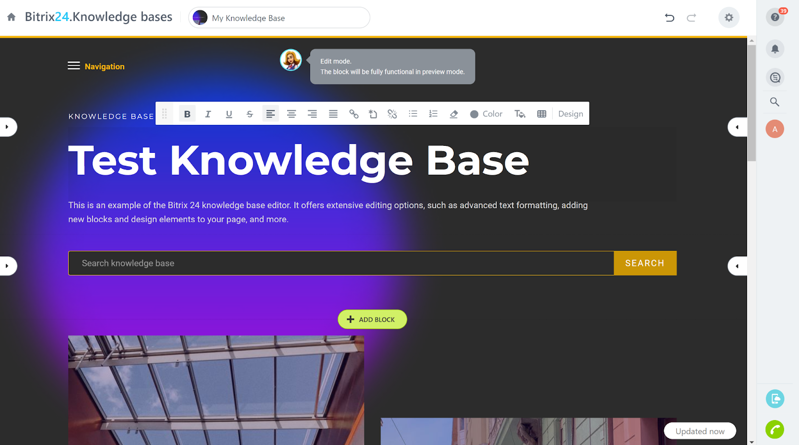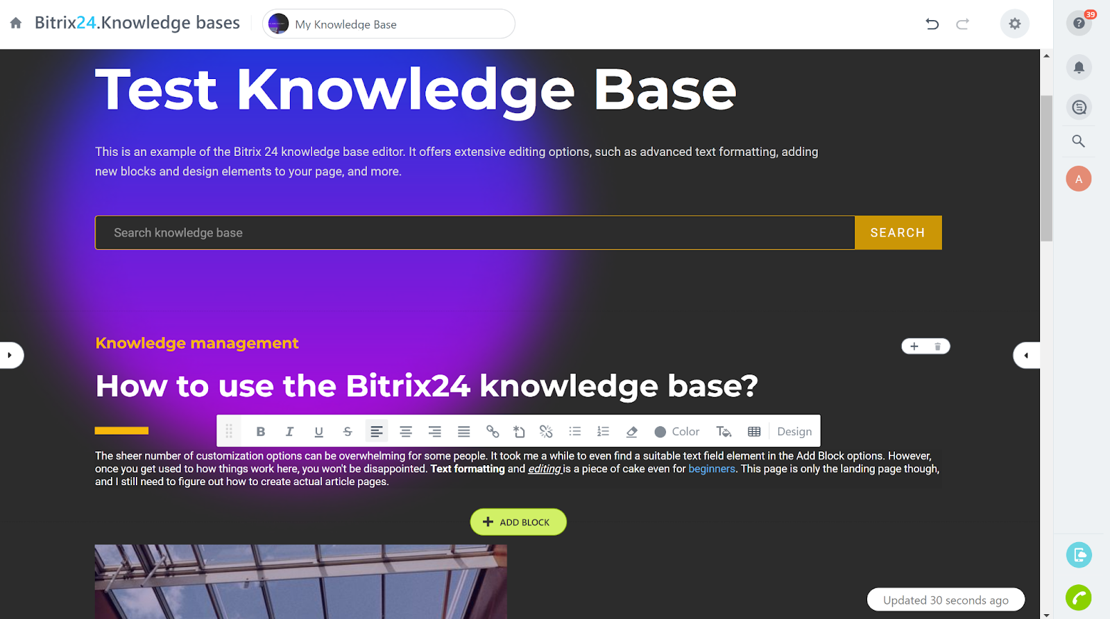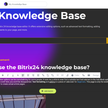 La base de connaissances Bitrix24 fonctionne comme un générateur de site Web, similaire à des services comme Wix. Vous pouvez créer une page vierge, ou travailler avec un modèle. Chaque élément de la page peut être personnalisé ou supprimé à volonté. Vous pouvez ajouter de nouveaux éléments en cliquant sur le bouton Ajouter un bloc. Le processus peut être un peu décourageant au début, mais avec un peu de patience et de pratique (et l’utilisation d’un guide d’aide inclus dans la base de connaissances sous le bouton point d’interrogation), vous serez sûrement en mesure de construire une base de connaissances impressionnante.