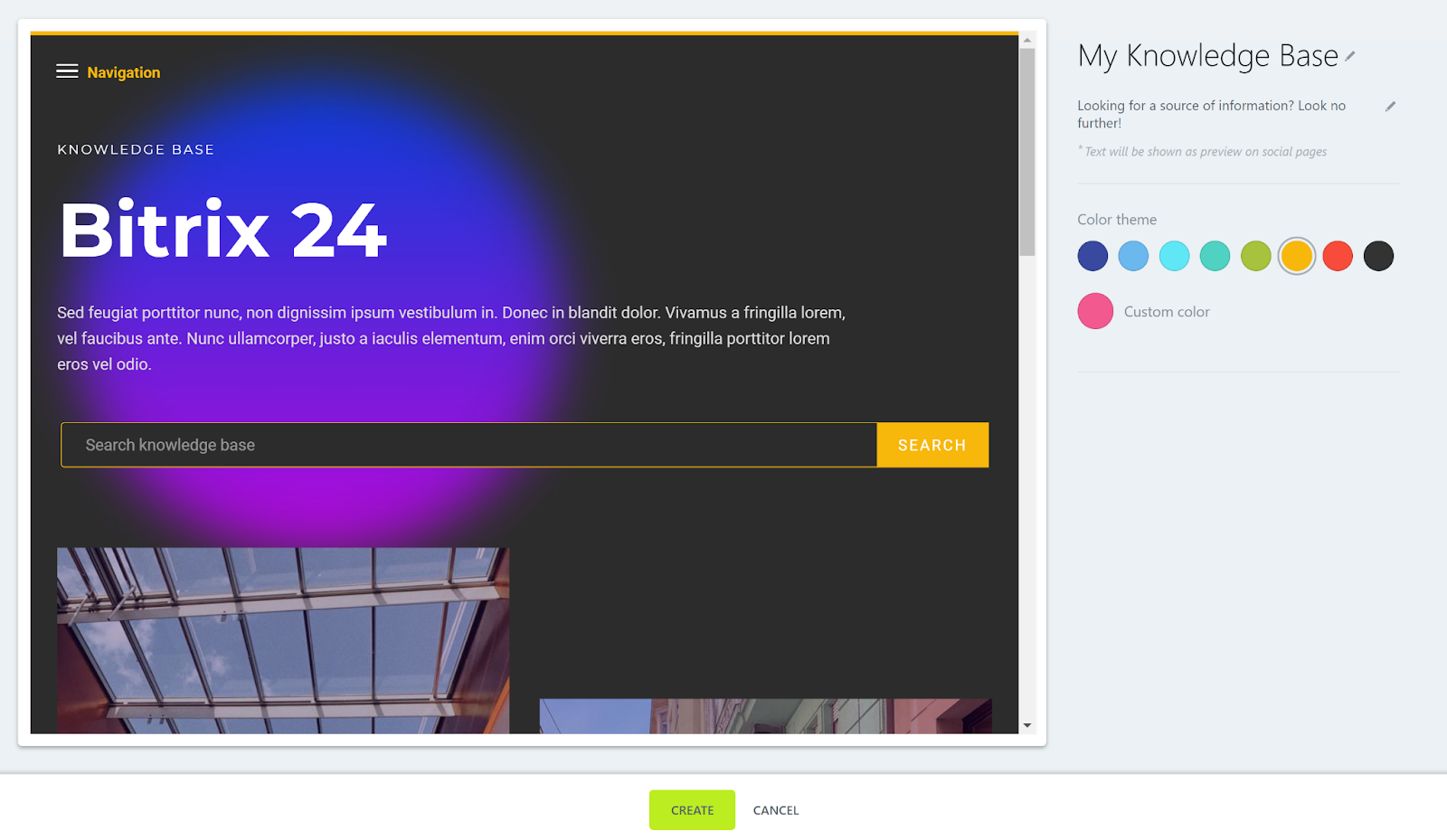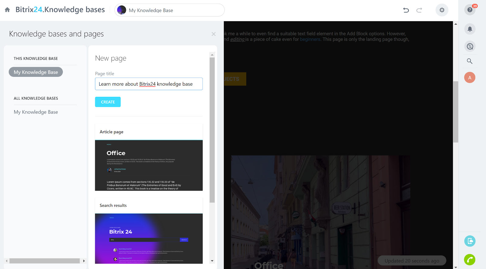 L’introduction à la base de connaissances de Bitrix24 se présente plutôt bien. Ceci grâce à un écran de bienvenue bien conçu qui vous offre deux options – créer une nouvelle base de connaissances, ou consulter le guide d’aide. Une fois que vous avez cliqué sur Créer une nouvelle base de connaissances, l’expérience agréable continue. Vous avez la possibilité de choisir un modèle de base de connaissances pour commencer, ou de partir de zéro. Dans les deux cas, vous disposez ensuite d’excellentes options de personnalisation.