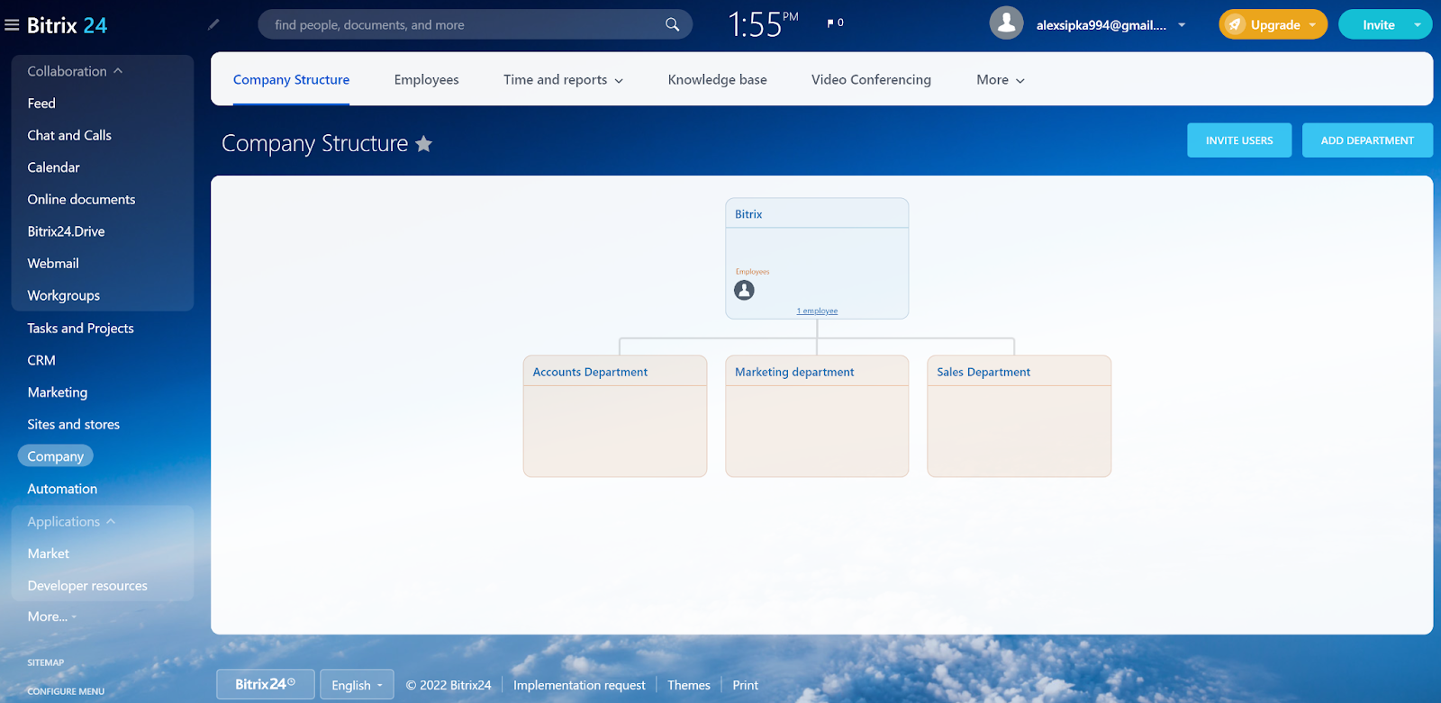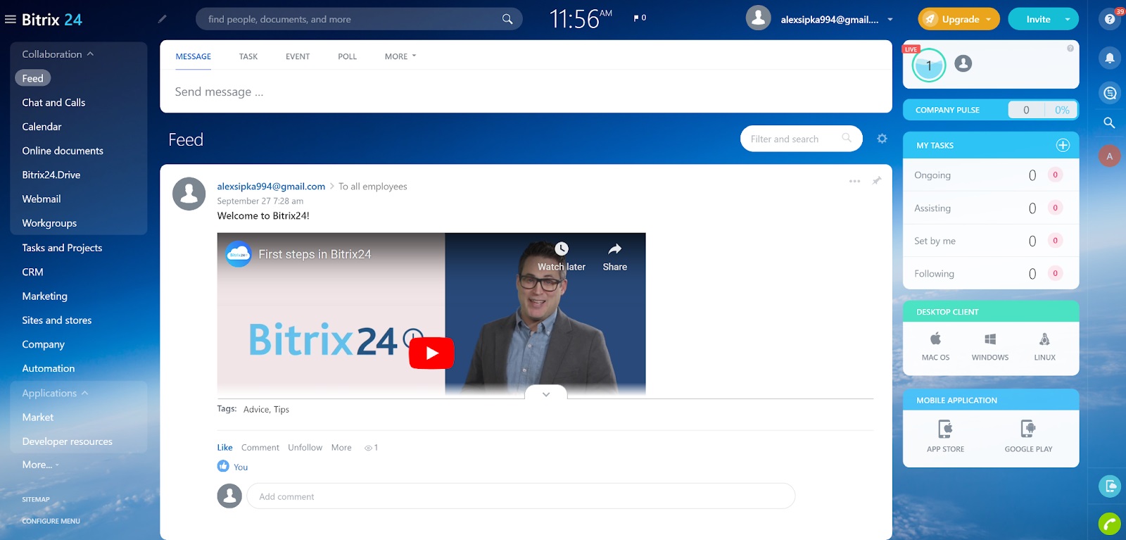 Ceux qui connaissent Bitrix24 savent que l’inscription est super facile, il suffit de remplir un formulaire d’inscription et de confirmer votre adresse e-mail. Ensuite, vous obtenez l’accès à votre compte Bitrix24 et vous pouvez commencer à vous familiariser avec l’interface utilisateur. J’ai utilisé l’application web Bitrix24 pour les besoins de cette évaluation, et bien que je sois déjà familier avec elle, il m’a fallu un certain temps pour commencer à me souvenir de la façon de naviguer efficacement.