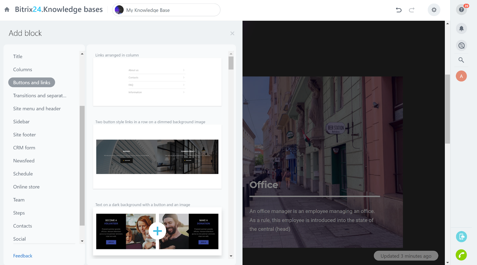 L’éditeur de base de connaissances de Bitrix24 vous permet de personnaliser à peu près tout. Vous pouvez ajouter de nouveaux blocs et choisir parmi une immense variété d’options – des champs de texte, des images, des vidéos et des titres, ainsi que des éléments de site Web comme des menus, des pieds de page, des boutons, des liens, des champs CRM, ou même une boutique en ligne. Je ne sais pas pourquoi quelqu’un voudrait ajouter une boutique en ligne à sa base de connaissances, mais je suppose qu’il est agréable d’avoir cette option disponible. Cet éditeur de base de connaissances est vraiment quelque chose d’autre, et vous pouvez toujours trouver ce dont vous avez besoin en toutes circonstances.