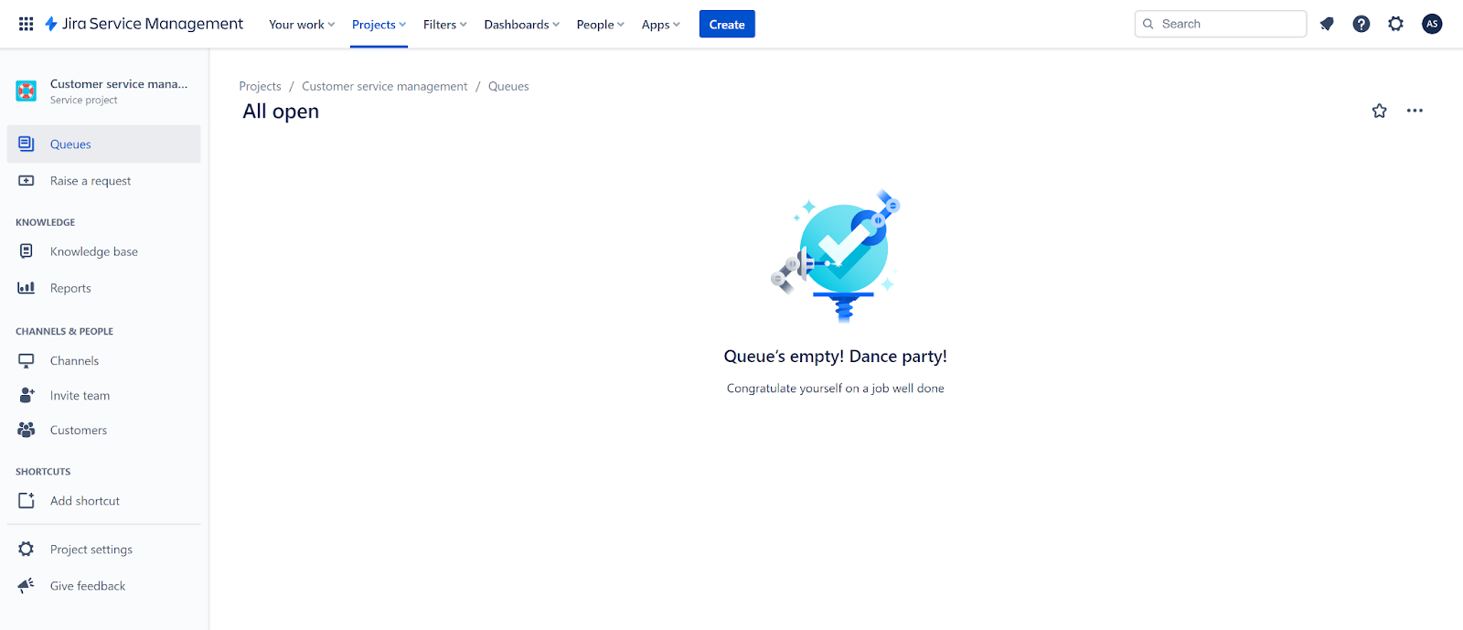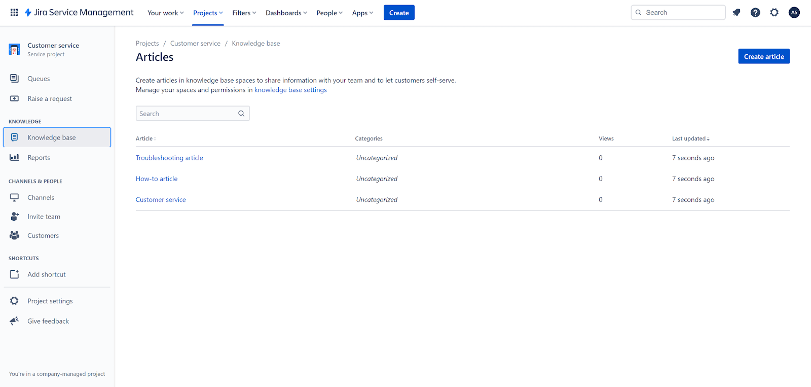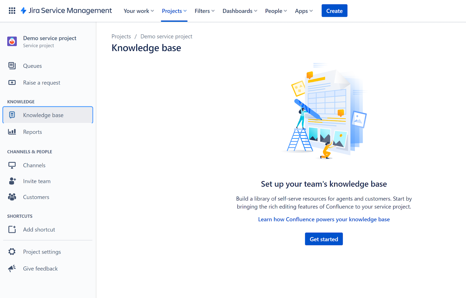 Une fois que vous cliquez dessus, vous pouvez voir l’ensemble du tableau de bord du projet et une interface vide qui fournit des informations sur les détails du projet. Deux menus sont visibles, le menu supérieur est destiné à la navigation générale de Jira Service Management, et le second, sur le côté gauche, est un menu pour un projet individuel que vous ouvrez. Vous pouvez trouver l’option de base de connaissances juste ici. Chaque projet distinct dispose d’une base de connaissances dans ce menu, de sorte que vous ne serez pas confus chaque fois que vous passez d’un projet à l’autre.