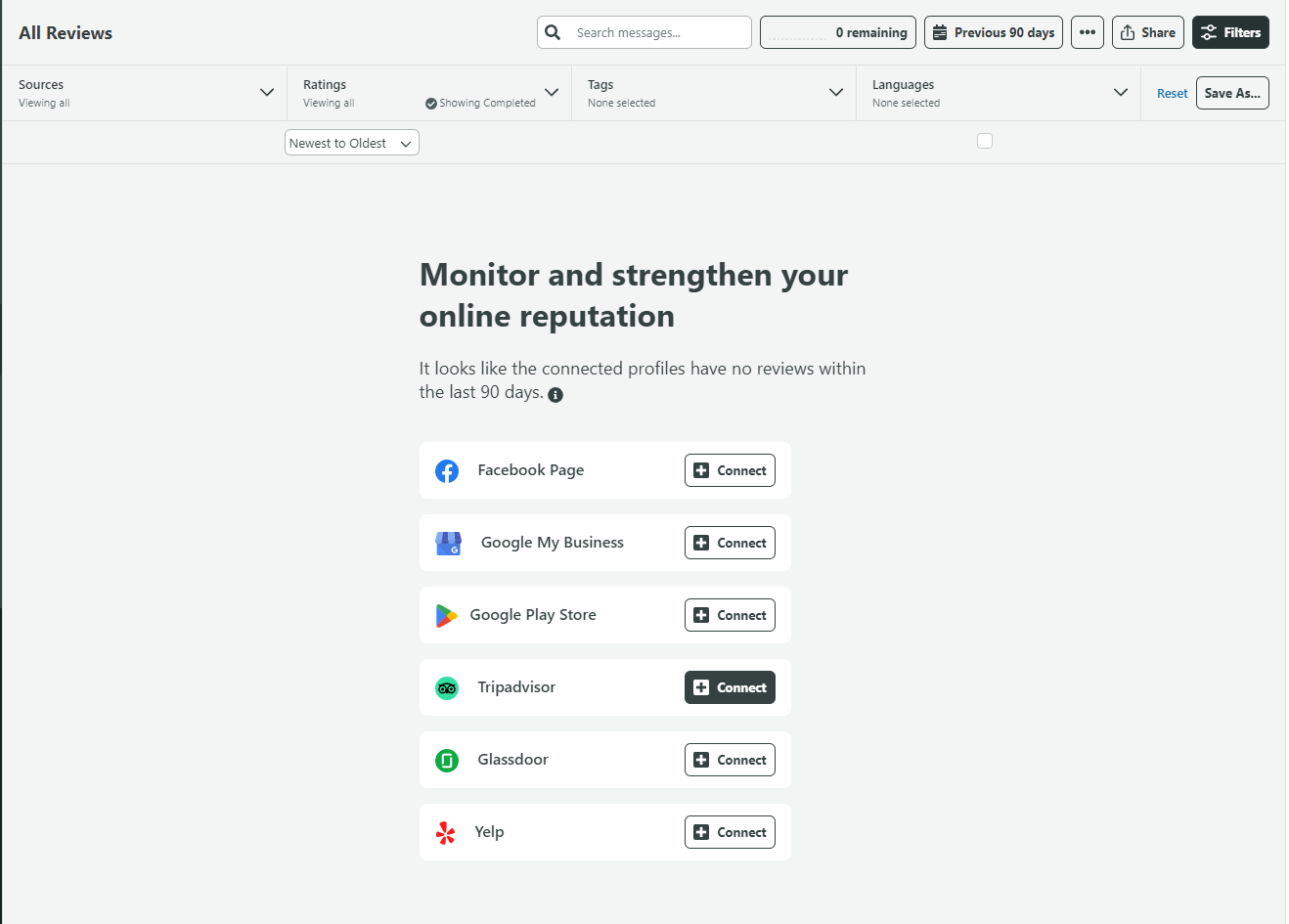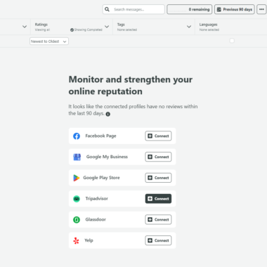 Une autre fonctionnalité qui peut s’avérer utile pour les équipes en contact avec les clients est la fonctionnalité Revues. Elle vous permet de connecter diverses plateformes de revues et de gérer tous les commentaires de vos clients à partir d’un seul endroit, ce qui vous évite de consulter chacune d’entre elles séparément.