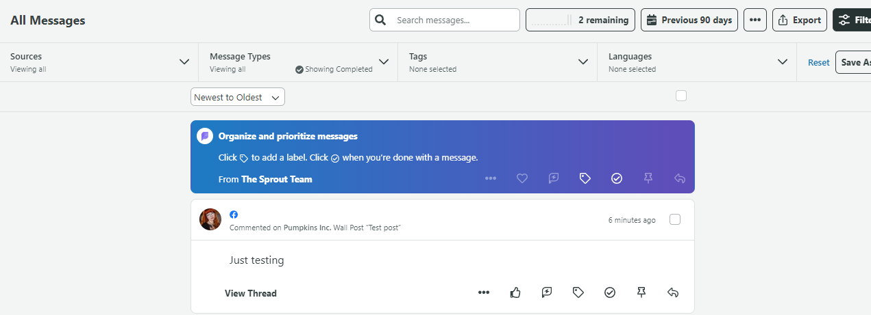 Sprout Social est avant tout une plateforme de gestion des réseaux sociaux plutôt qu’une plateforme de support client. Donc, si je devais juger uniquement les fonctionnalités du service client, je ne me sentirais pas mal de dire qu’elles ne sont pas particulièrement étendues. La première chose que j’ai remarquée, c’est que Sprout Social ne semble pas avoir mis en place un quelconque système de tickets. L’accent est davantage mis sur des fonctionnalités telles que la programmation des publications, l’étude des analyses concurrentielles et la concentration sur votre présence globale sur les réseaux sociaux et la santé de votre marque.