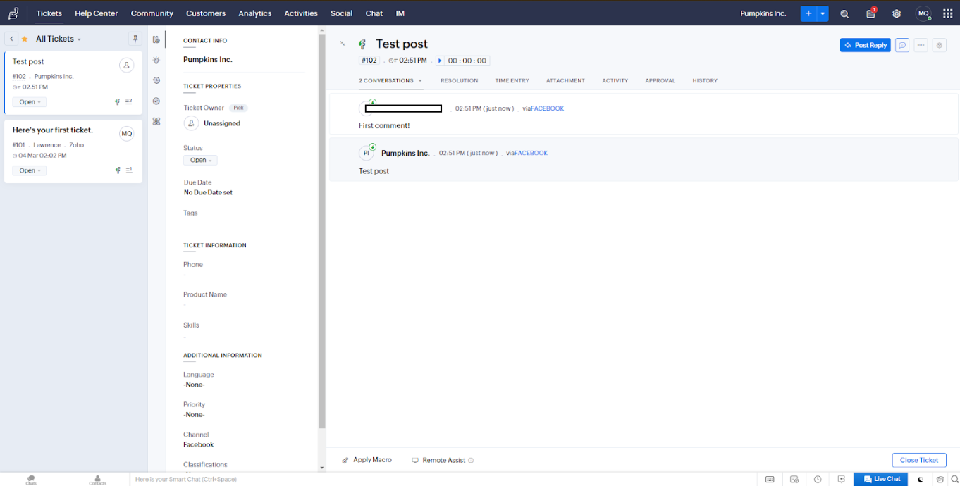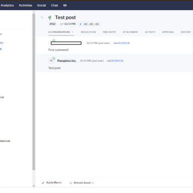 Tester l’assistance de Zoho Desk sur les réseaux sociaux a été très simple. Sur ma page Facebook, j’ai posté un statut et un “client” l’a commenté. J’ai immédiatement reçu une notification et un ticket d’assistance des réseaux sociaux dans le panneau de l’agent.