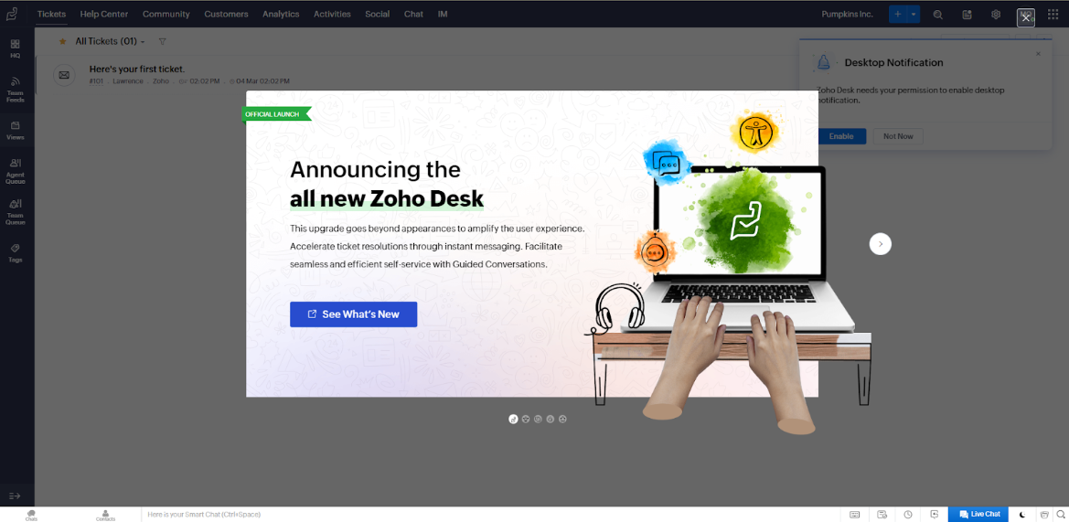 Le premier coup d’œil à l’interface utilisateur de Zoho Desk a été agréable. Un pop-up avec un graphique attrayant qui m’a guidé à travers les nouveaux ajouts du logiciel a été une touche agréable. J’ai pu la passer, mais je l’ai survolée en raison de son aspect attrayant. Toutefois, je peux comprendre que cette image de mains sévères puisse en effrayer plus d’un.