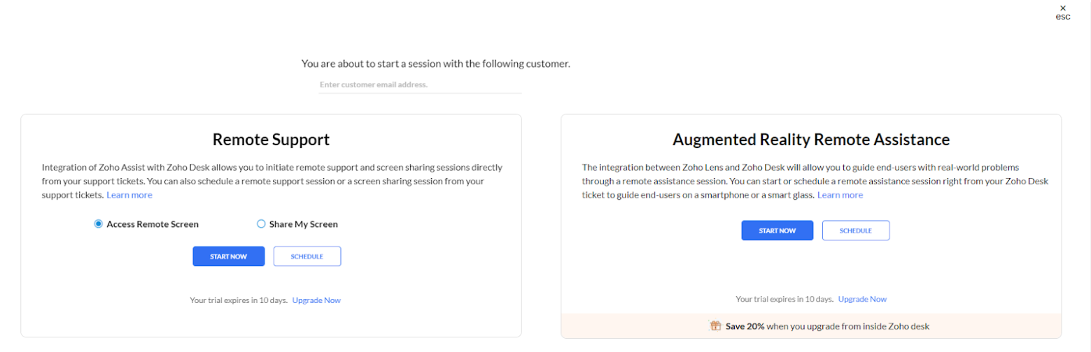 Lorsque vous communiquez avec des clients, vous pouvez ajouter des pièces jointes à partir de votre ordinateur ou du cloud. Bien que vous puissiez appliquer des macros, il n’y en a pas de préfabriquées, ce qui m’a un peu déçu. En revanche, j’ai apprécié l’option Support à distance. Zoho Desk offre même une assistance à distance en réalité augmentée si vous mettez à jour votre formule.