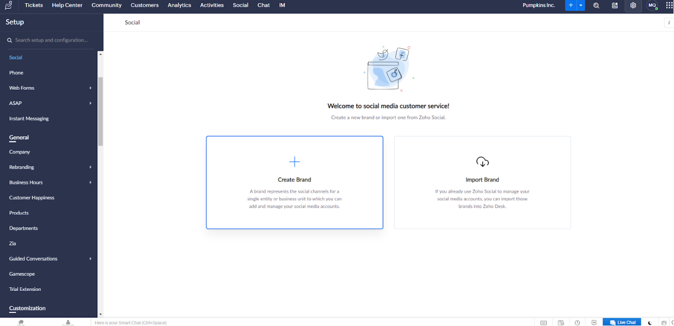 En appuyant sur le bouton Démarré j’ai été conduit à une page où je pouvais choisir de créer ou d’importer ma marque. Et comme Pumpkins Inc. n’avait pas de données antérieures sur la plateforme Zoho Desk, j’ai utilisé l’option Créer une marque.