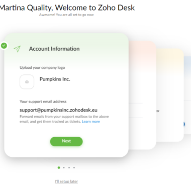 Dans un premier temps, Zoho Desk m’a donné la possibilité de remplir tous les détails supplémentaires et de configurer mon compte dans son intégralité, ou de laisser ce processus pour plus tard. L’approche ergonomique de l’interface m’a incité à remplir d’emblée environ 50 % des champs, puis j’ai testé le logiciel.