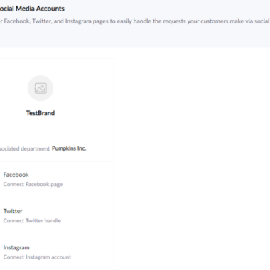 Pour ce qui est de la configuration des réseaux sociaux, une fois la marque prête, Zoho Desk m’a suggéré de connecter ma page professionnelle Facebook, mon compte Instagram et mon compte Twitter.