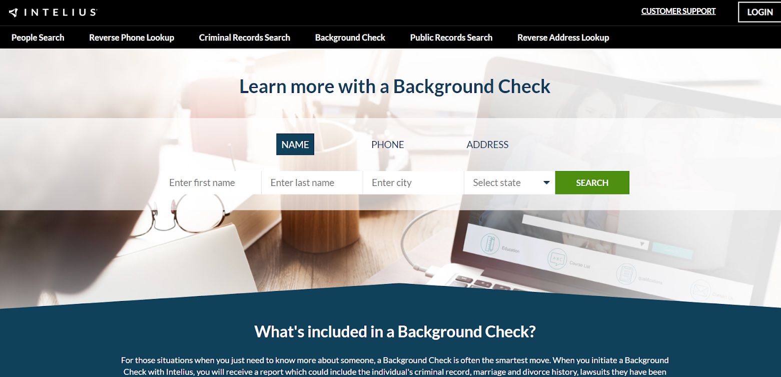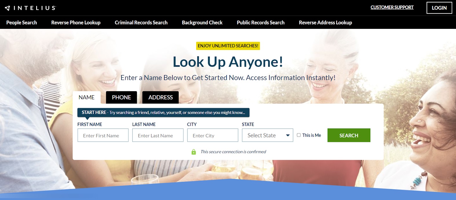 D’emblée, vous voyez clairement que vous pouvez effectuer une recherche sur la base du nom, du numéro de téléphone et de l’adresse. Intelius propose également des informations supplémentaires, telles que le casier judiciaire, la vérification des antécédents et les archives publiques. Toutes ces options sont visibles en haut de la page.