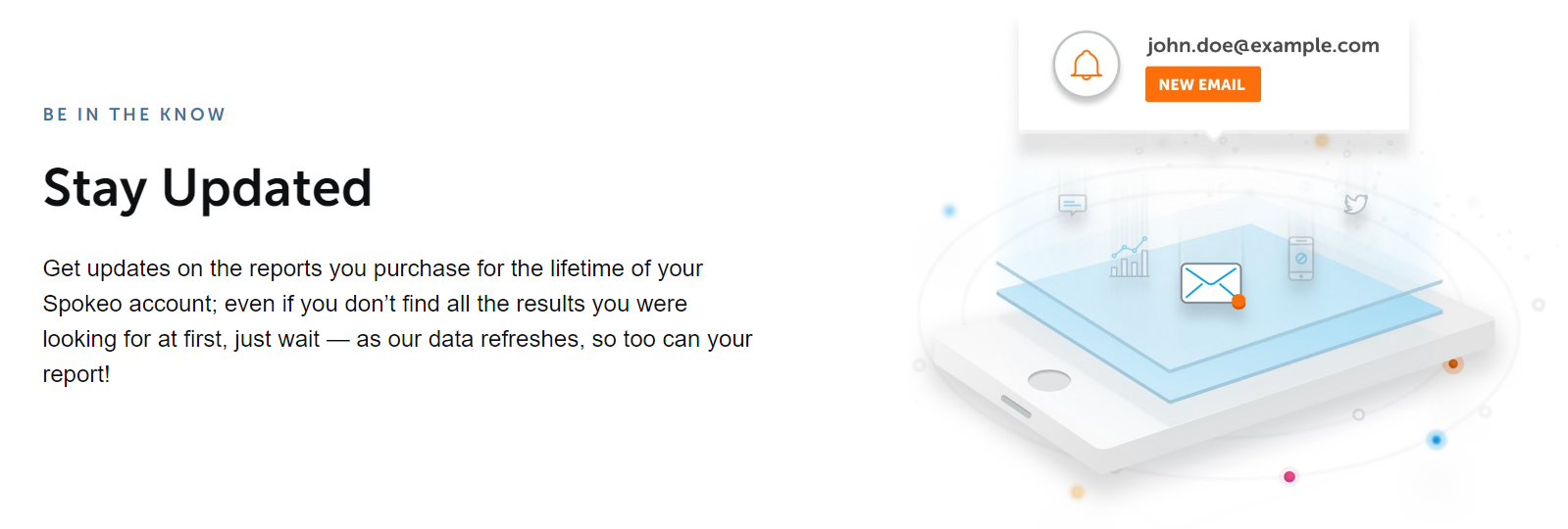 Spokeo fournit des mises à jour des rapports que vous avez achetés précédemment, de sorte que vous aurez toujours accès aux informations les plus récentes. Même si la base de données n’a pas trouvé de résultats au moment de votre recherche, vous pourrez voir les nouvelles informations et les nouveaux rapports après une mise à jour.