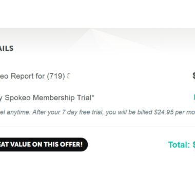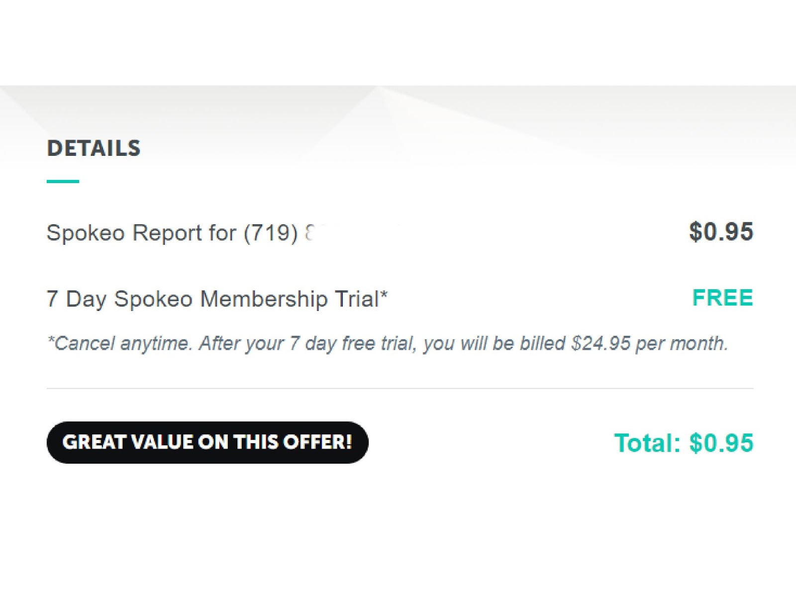 Spokeo propose un essai gratuit de 7 jours, ainsi que l’achat d’un seul rapport pour 0,95 $. Cependant, vous devez être prudent si vous décidez de vous inscrire à l’essai gratuit car, après les 7 premiers jours, vous serez facturé 24,95 $ si vous n’annulez pas l’essai. Cela est dû au fait que vous devez fournir les informations relatives à votre carte de crédit, même si vous ne vous inscrivez que pour l’essai gratuit.