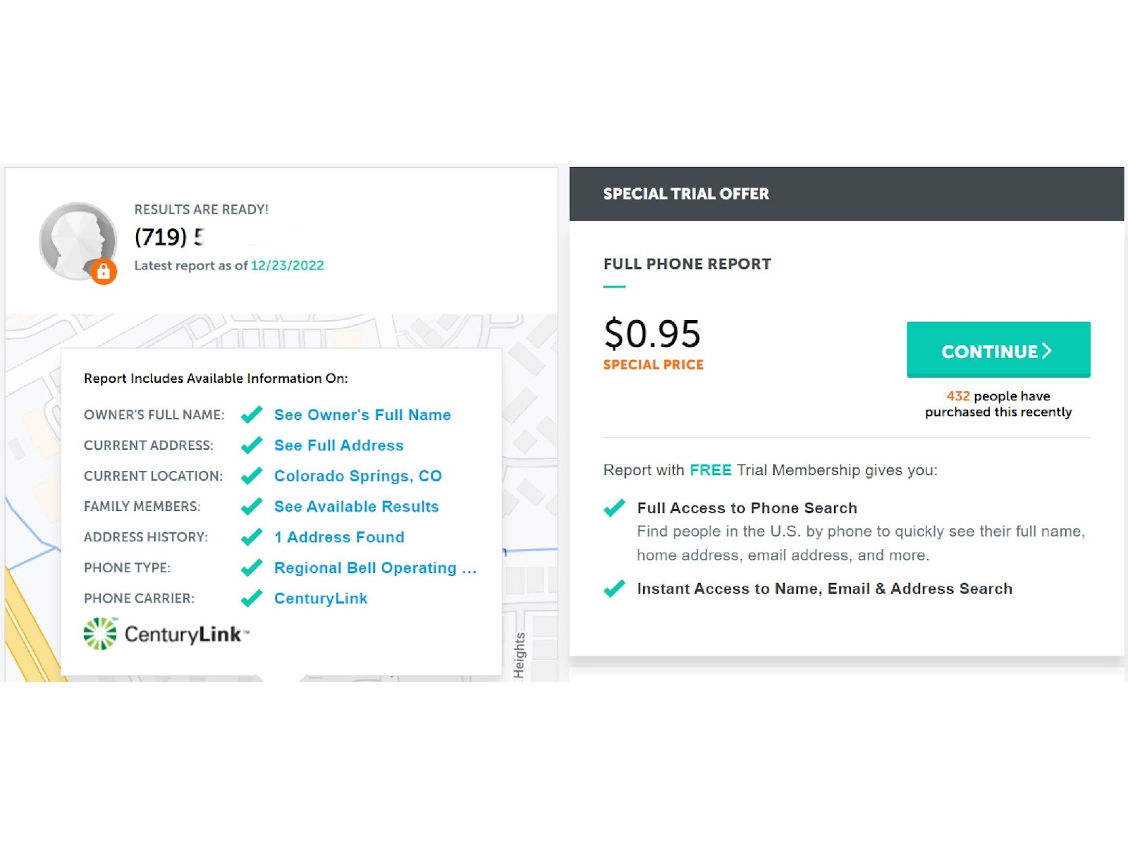 La génération de données est rapide grâce à la fonction de recherche inversée de numéros de téléphone. Toutefois, il est décevant de constater qu’une fois que Spokeo a trouvé l’appelant inconnu, tous les résultats sont bloqués et vous obligent à devenir membre ou à payer des frais supplémentaires pour un seul rapport.