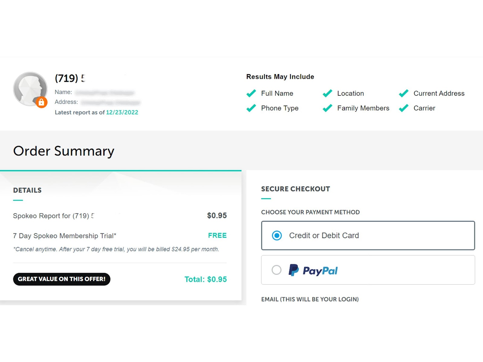 Contrairement à de nombreux autres fournisseurs de services de recherche inversée de numéros de téléphone, Spokeo ne propose pas de version gratuite. Même s’il vous permet de saisir le numéro dans la barre de recherche, tous les résultats sont bloqués jusqu’à ce que vous payiez. Les formules d’abonnement et les tarifs ne sont pas faciles à trouver sur le site web, car ils ne sont pas tous regroupés au même endroit. Il se peut donc que vous ayez du mal à les trouver.