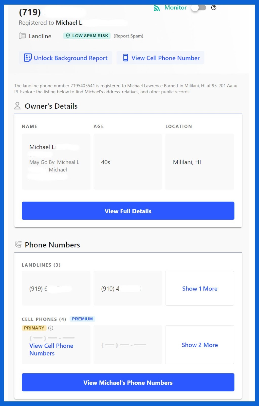 Dans certains cas, le site Internet/l’application peut générer des résultats plus détaillés. Dans ce cas, vous pouvez voir un nom associé au numéro et des détails tels qu’une adresse, l’âge de la personne, d’autres numéros de téléphone qui pourraient être liés à la même personne, des membres de la famille, etc. Cependant, si vous avez besoin de plus d’informations sur leurs rapports criminels et d’antécédents, ceux-ci sont disponibles après avoir payé des frais supplémentaires.