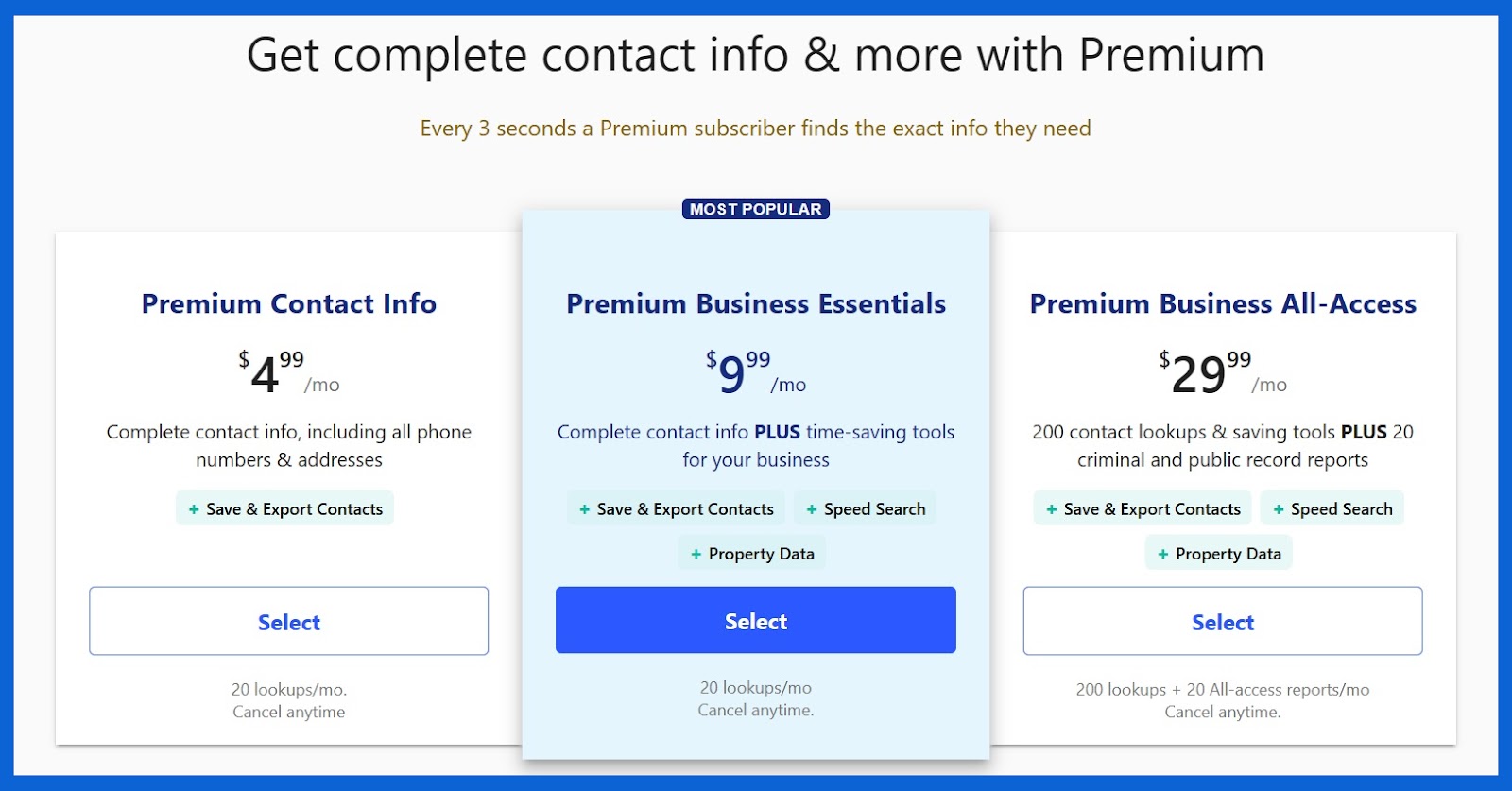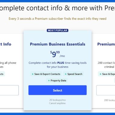 La troisième formule d’abonnement coûte 29,99 $/mois et comprend jusqu’à 200 recherches par mois, 20 rapports criminels et publics, ainsi que toutes les autres fonctionnalités incluses dans les Premium Business Essentials. Comme pour les autres formules, vous pouvez payer mensuellement ou annuellement, ce qui revient à 179,88 $ et équivaut à 14,99 $/mois.