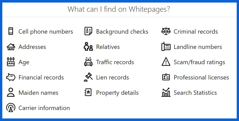 Whitepages étant une société privée, elle obtient ses données à partir de sources accessibles au public et de fournisseurs de données tiers. Cela peut affecter la fiabilité des informations fournies. Elle encourage ses utilisateurs à garder ce fait à l’esprit et à vérifier toutes les informations.