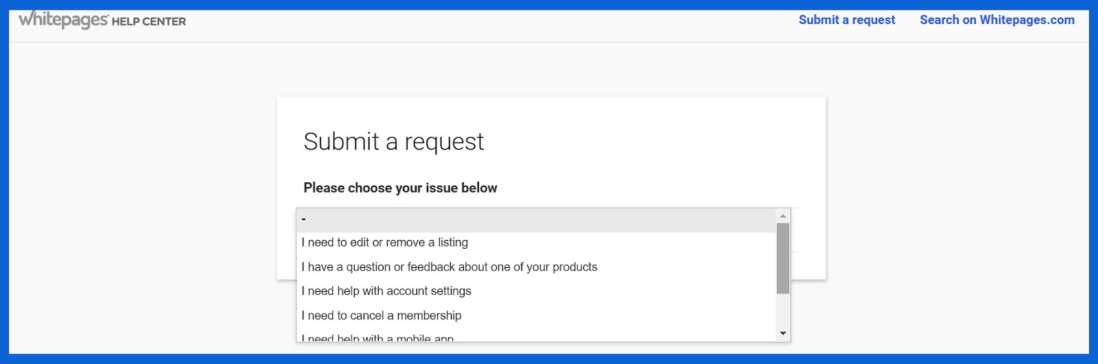Vous pouvez contacter le service clientèle de Whitepages en remplissant un formulaire de demande sur leur site Internet. Ils ne proposent pas de chat en direct ou d’assistance clientèle instantanée.