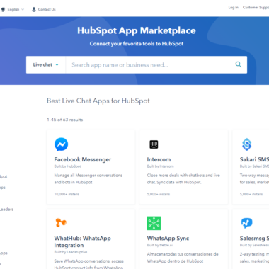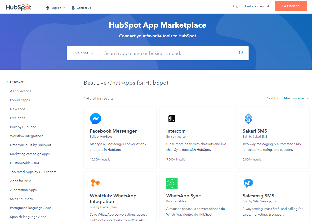 J’étais également très curieux de voir les intégrations de HubSpot. Une fois que vous naviguez sur leur App Marketplace, vous pouvez voir beaucoup d’intégrations à choisir, y compris celles qui sont utiles pour des choses comme les ventes et le service client. Parmi les exemples populaires d’intégrations de chat en direct, citons Intercom, Sakari SMS, Facebook Messenger, Salesmsg SMS et TruConversations.