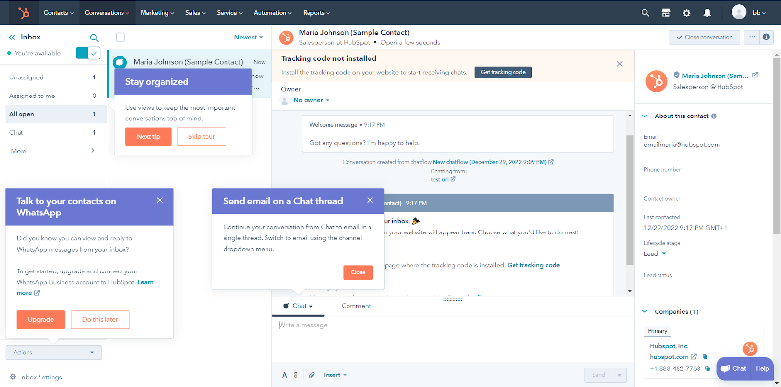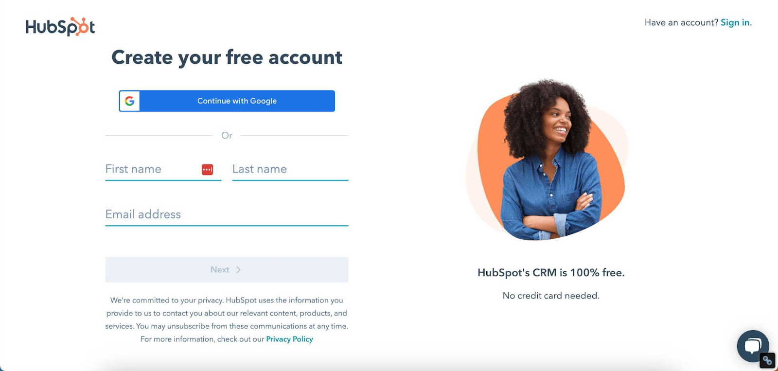 HubSpot est une plateforme de gestion de la relation client (CRM) et un logiciel de marketing, de vente et de service client. Il fournit des outils et des fonctionnalités pour aider les entreprises à gérer et à analyser les interactions et les données des clients tout au long de leur cycle de vie, dans le but d’améliorer les relations avec les clients et de stimuler la croissance de l’entreprise. La fonctionnalité la plus intéressante de HubSpot pour moi était bien sûr les chatbots, que j’ai testés pour les besoins de cette revue. Mais avant d’utiliser les chatbots, vous devez d’abord vous inscrire.