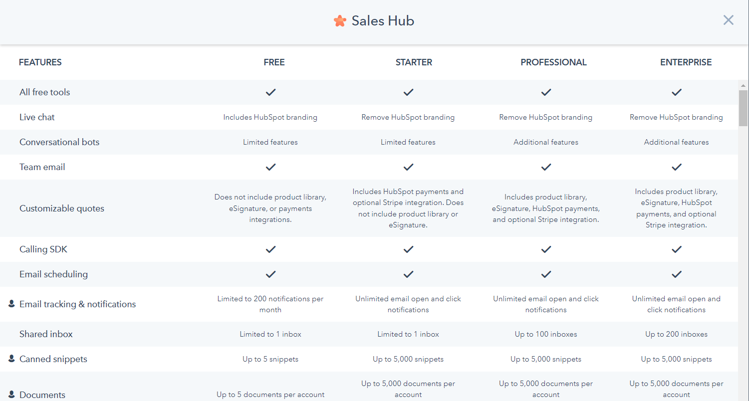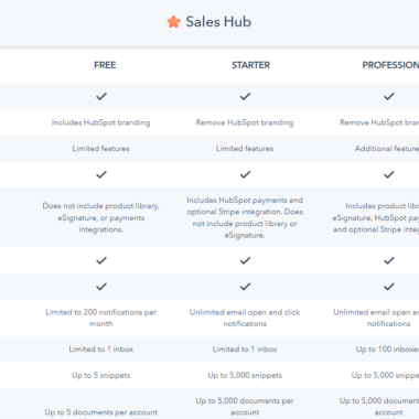 La première chose à noter est que HubSpot offre à ses abonnés une formule gratuite à vie. C’est une excellente nouvelle pour les adeptes des solutions non payantes. De plus, il existe des plans payants disponibles. Vous trouverez ci-dessous les détails de tous les plans disponibles.