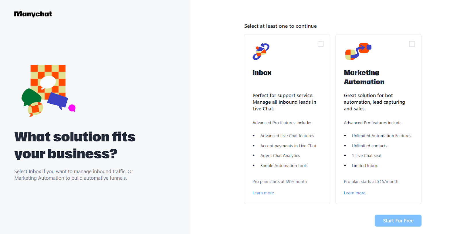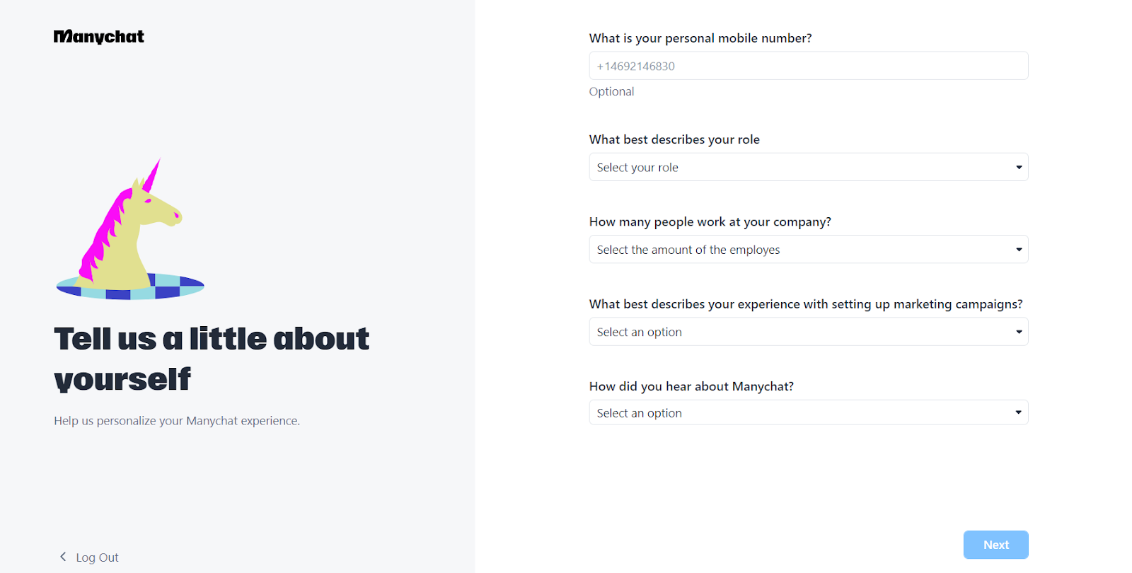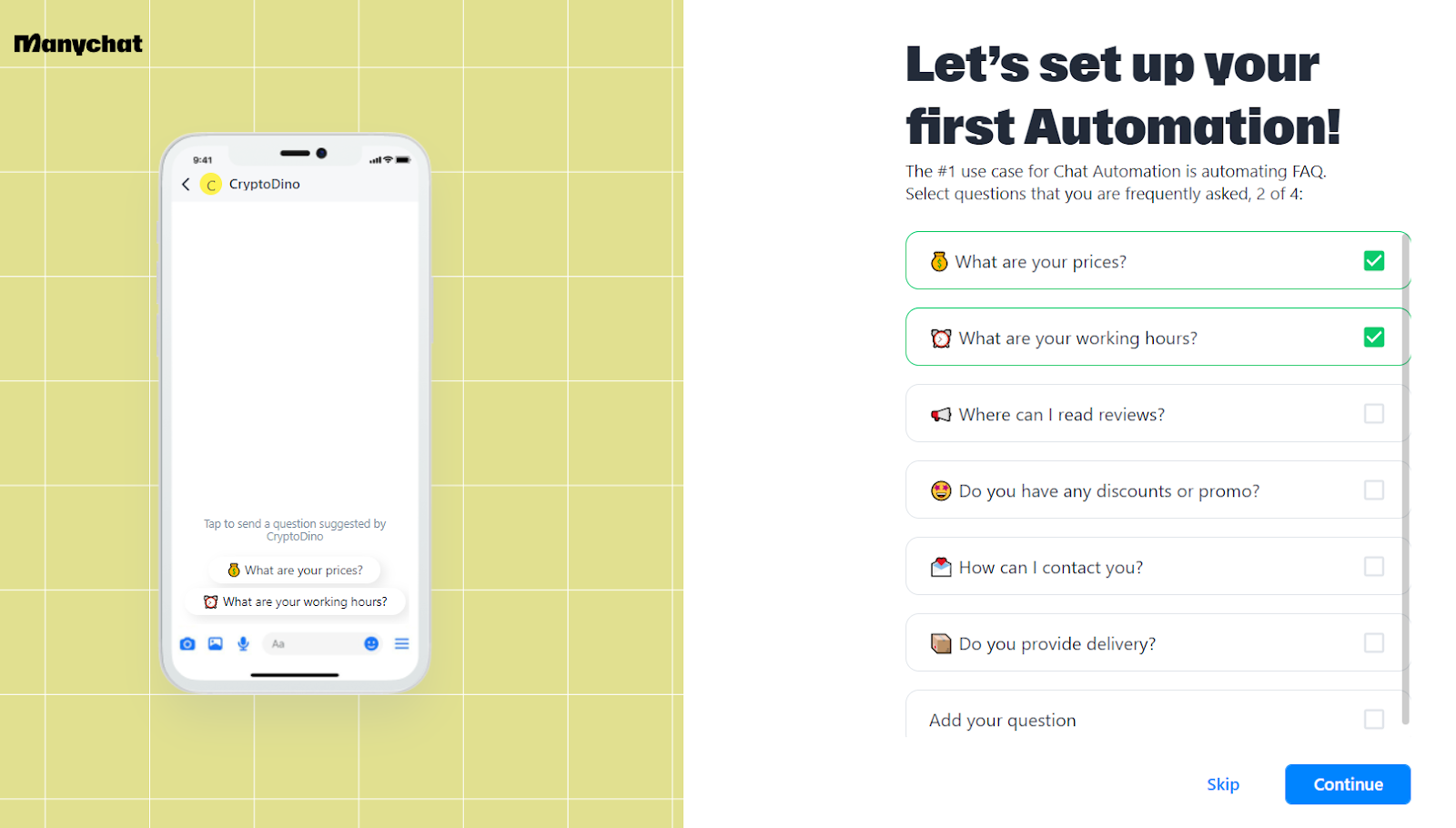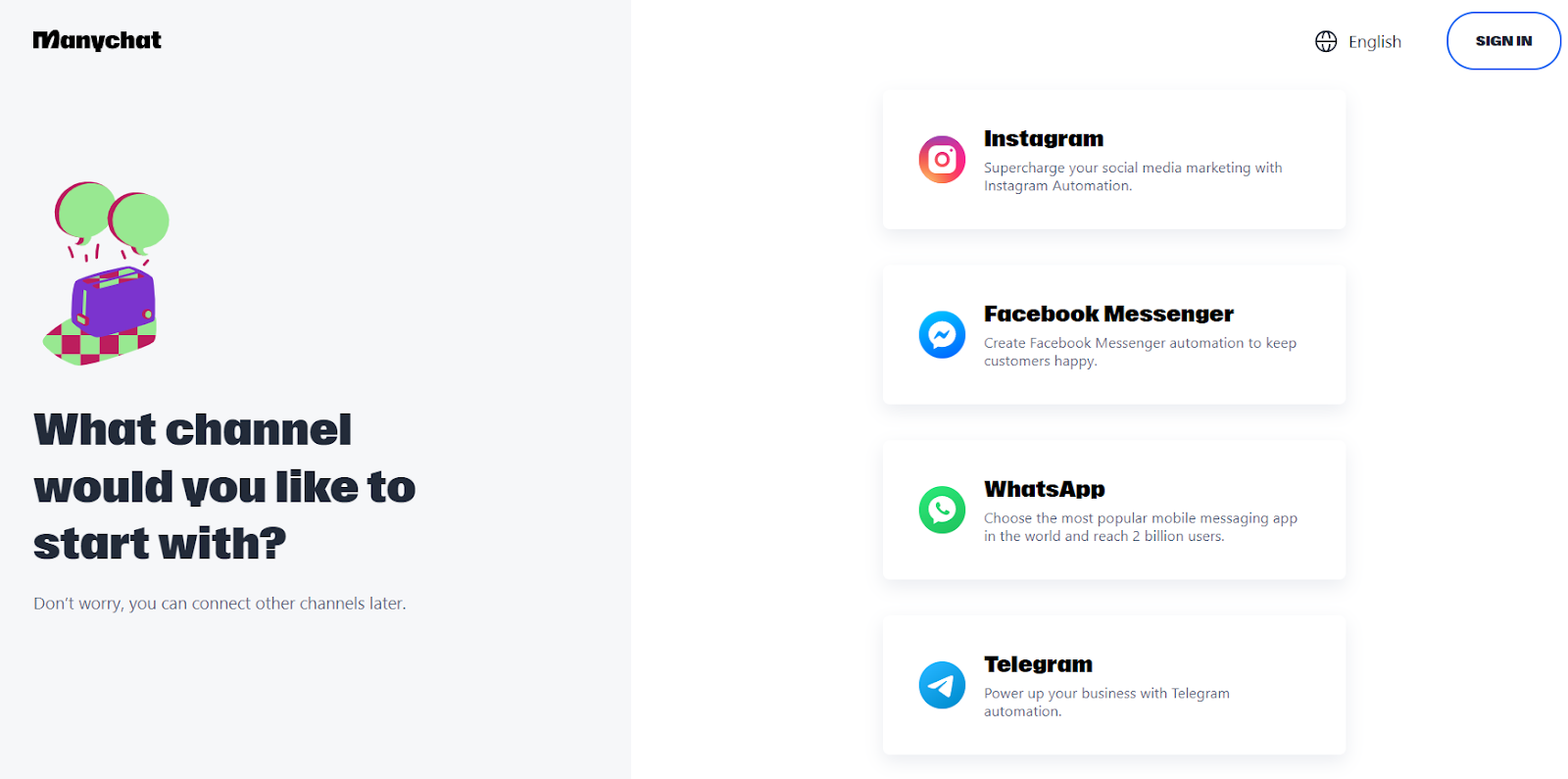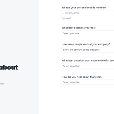 Au cours du processus d’inscription, Manychat propose une expérience simple qui aide les utilisateurs à configurer leur chatbot. La durée de l’inscription à Manychat dépend de la familiarité de l’utilisateur avec les processus d’inscription de ce type. En général, le processus d’installation peut prendre de quelques minutes à plusieurs minutes.