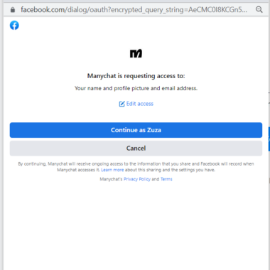 Manychat a demandé l’accès à un tas de détails différents me concernant et concernant les pages que je possède, tels que le nom, la photo de profil, l’adresse mail, la gestion et l’accès aux pages, et plus encore. Je n’ai pas eu d’autre choix que d’accepter et j’ai pu aller plus loin.