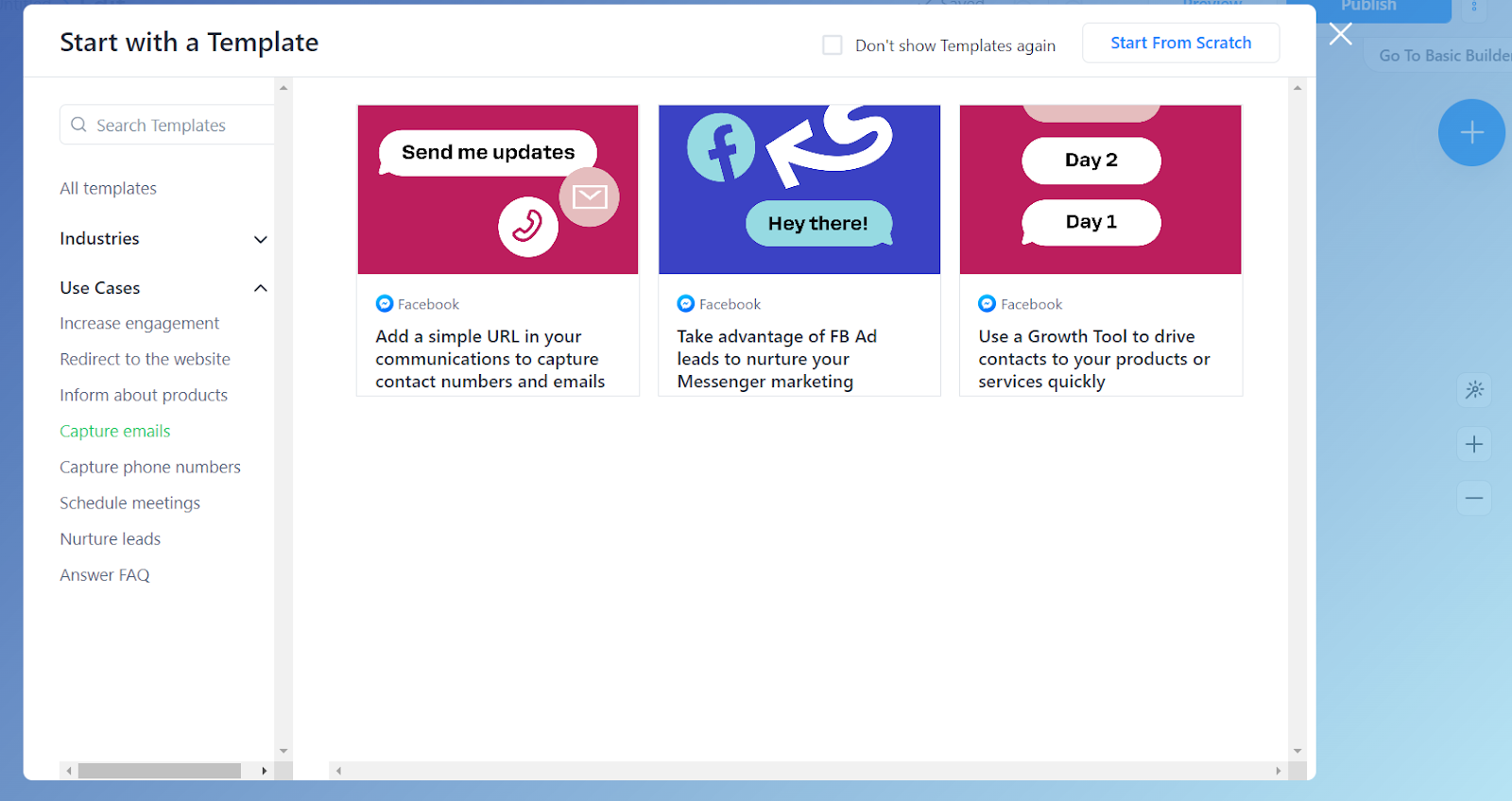 J’apprécie particulièrement les fonctionnalités suivantes : la configuration des mots-clés, les outils de croissance et l’éditeur par glisser-déposer. Il existe également de nombreux modèles et séquences d’automatisation prédéfinis que j’ai trouvés utiles pour démarrer rapidement. Mes exemples préférés incluent des cas d’utilisation tels que “augmenter l’engagement”, “capturer des numéros de téléphone” et “informer sur les produits”.