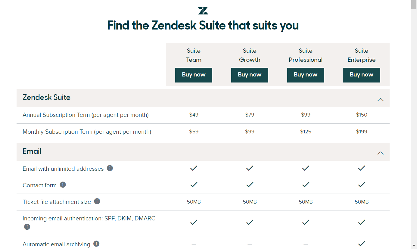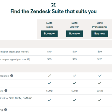 Tout d’abord, Zendesk ne propose aucune formule gratuite, ce qui est un peu dommage. D’un autre côté, vous pourriez être heureux d’apprendre qu’il y a un essai gratuit de 14 jours disponible pour tous les types de formule, sauf la plus chère. Vous trouverez plus de détails sur cette formule tarifaire ci-dessous.