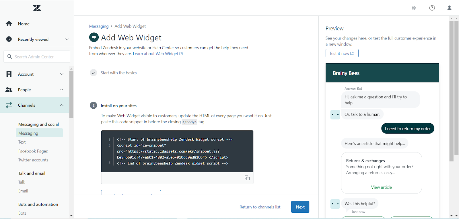 En ce qui concerne l’implémentation du chatbot, je n’ai rien trouvé à redire. En suivant les instructions fournies par Zendesk, j’ai pu naviguer à travers l’ensemble du processus assez facilement et sans plus d’efforts.