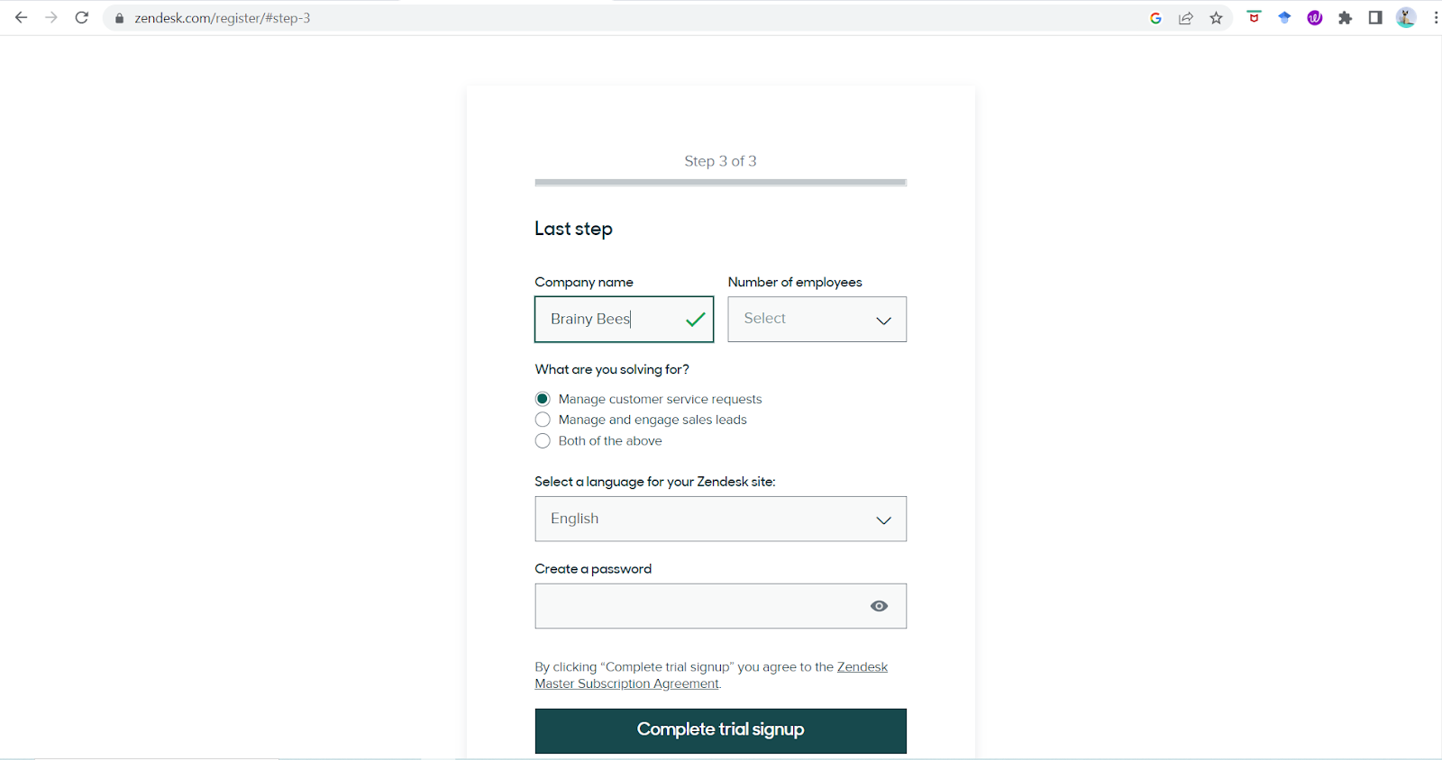 Pour commencer à utiliser les chatbots de Zendesk, je me suis rendu sur leur site Internet et j’ai cliqué sur le bouton “Essai gratuit”. C’est à ce moment-là que j’ai pu commencer la procédure d’inscription. Au total, cela m’a pris environ 20 minutes. C’est plus long que pour d’autres solutions, dont certaines ne prennent que quelques minutes. Néanmoins, j’ai trouvé que c’était correct. Il convient de noter que j’ai dû attendre environ 18 minutes pour recevoir mon mail de confirmation. C’est ce qui explique la longueur du processus d’inscription. Lorsque vous créez votre compte pour profiter d’un essai, il vous est demandé de fournir les informations suivantes :
