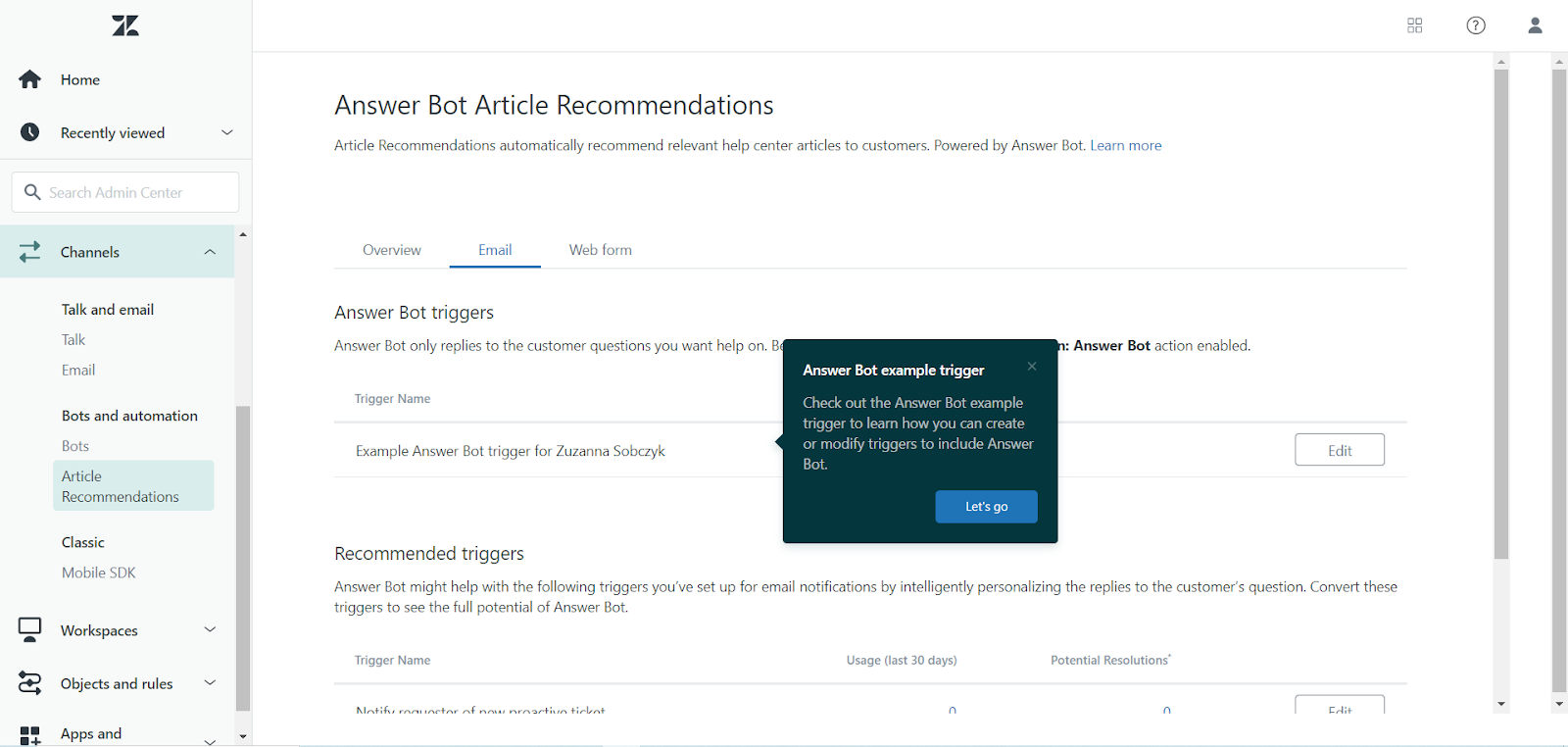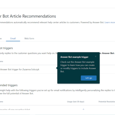 En ce qui concerne les fonctionnalités disponibles, j’ai été positivement surpris par quelques-unes. Tout d’abord, vous pouvez mettre en place un bot de réponse avec des recommandations d’articles pour vos clients, ce que je trouve génial. Deuxièmement, il est possible d’intégrer Zendesk à une belle gamme d’outils que beaucoup de gens utilisent tous les jours, comme Slack ou Shopify.