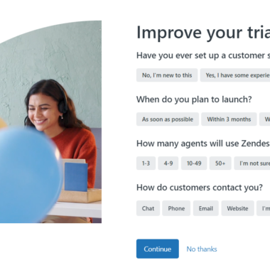 Juste après mon inscription, on m’a proposé des moyens d’améliorer l’expérience de mon essai. En répondant à quatre questions simples posées par Zendesk, j’ai pu apporter à mon essai des modifications positives qui me permettraient d’en profiter davantage.